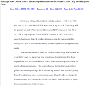 In the 2024 drug case, the United States submitted a Sentencing Memorandum to support its request for the 12-and-a-half year prison sentence. The Sentencing Memorandum lays out Mr. Fowler’s extensive criminal history in horrifying detail.